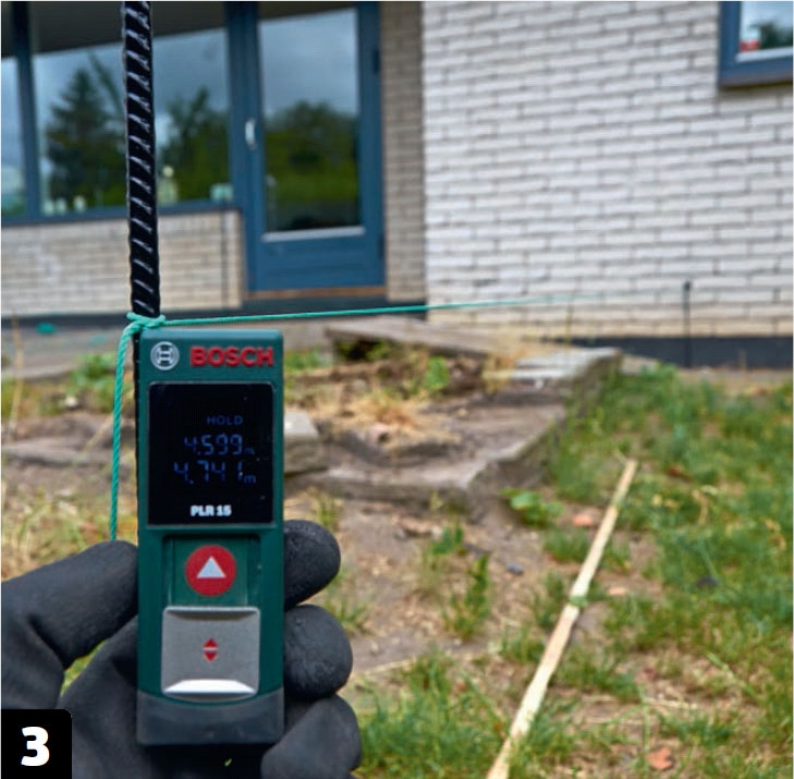 Mät upp. För att säkerställa att bjälkarna ligger vinkelrätt mot huset, använder vi Pytagoras sats till att mäta upp. Bygg en stor triangel av tre brädor i förhållandet 3:4:5, till exempel 3, 4 och 5 meter.