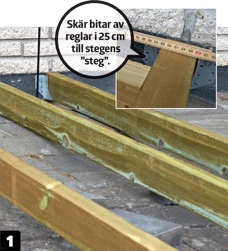 Stegarna består helt enkelt av två bjälkar som har monterats med endast 25 cm mellanrum i stället för 60. I mellanrummet fäster vi 25 cm långa reglar med 40 cm:s avstånd mellan dem. Konstruktionerna liknar stegar och det finns nu plats till att montera en längsgående bräda.