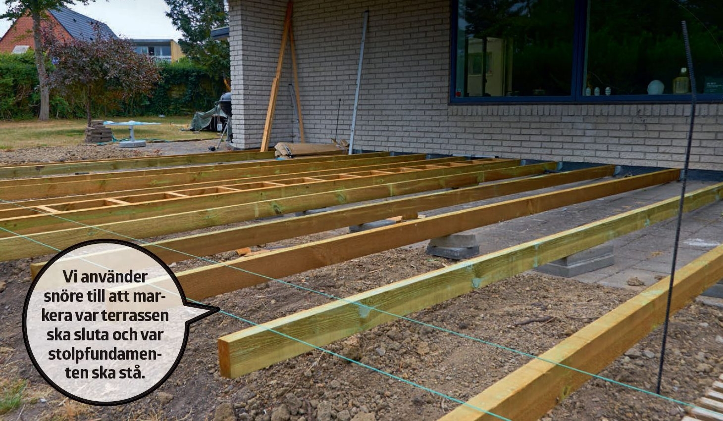 Bjälkarna klossas upp. Alla bjälkar klos-sas upp i rätt höjd med plattor på mitten. Det yttersta gröna snöret markerar terrassens slutliga längd och det andra var en stödjande bärlina ska sättas upp.