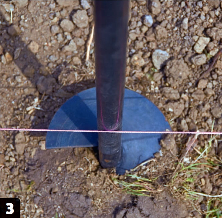 Markera var stolpfundamenten ska vara. Vi sätter dem i jorden med cirka en meters mellanrum. På så sätt får bärlinan ett hållfast stöd.