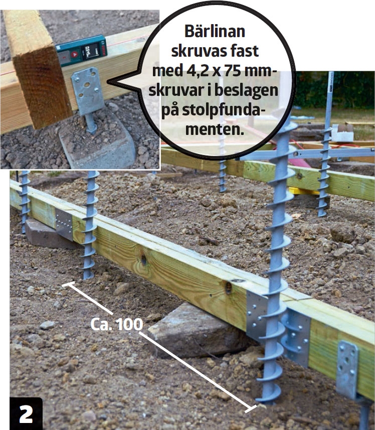 Stolpfundamenten är på plats och vi kan nu sätta ihop den bärlina av reglar som änden på bjälkarna ska skruvas fast på. När bärlinan är på plats kommer det roliga: jordskruvarna. Jämfört med att gräva ned betongplintar i jorden är arbetet med jordskruvarna en lek. Med en kraftig mutterdragare kan vi hamra ned en jordskruv i jorden på mindre än en halv minut!