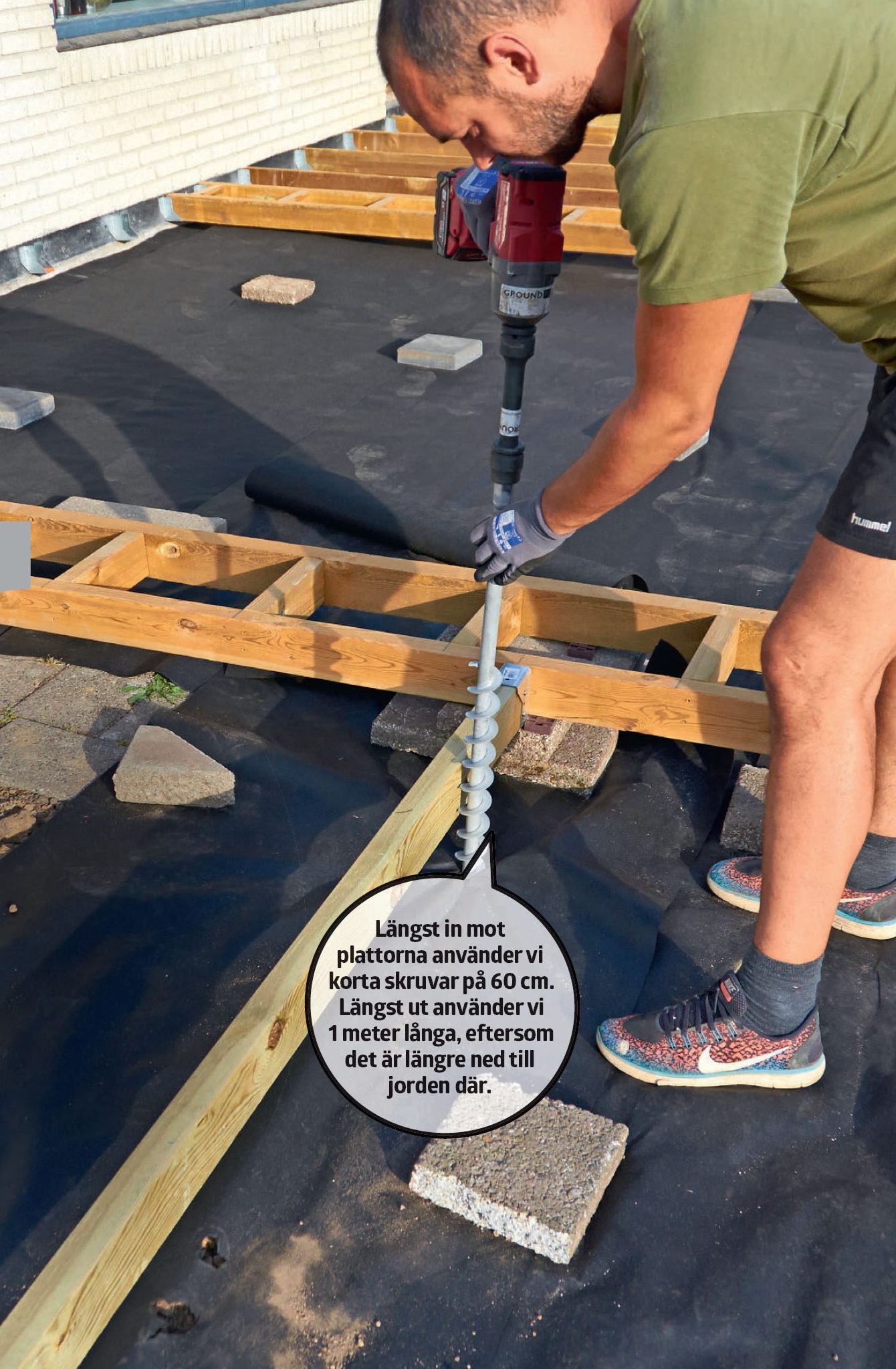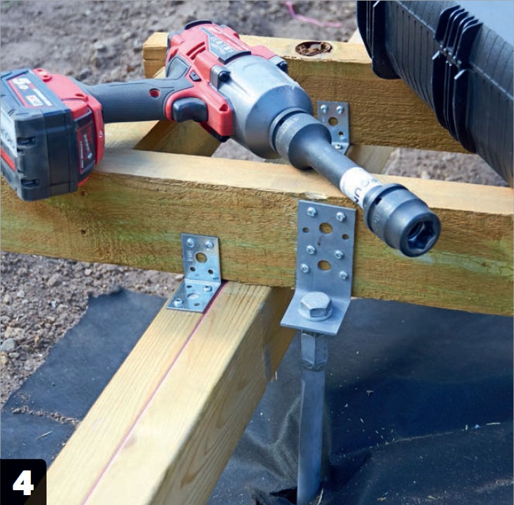 Skruvarna sätts i jorden. Bjälkarna är nu vågräta och fästs i änden till stolpfundamenten, och nu kan vi börja skruva ned skruvarna i jorden med en mutterdragare.