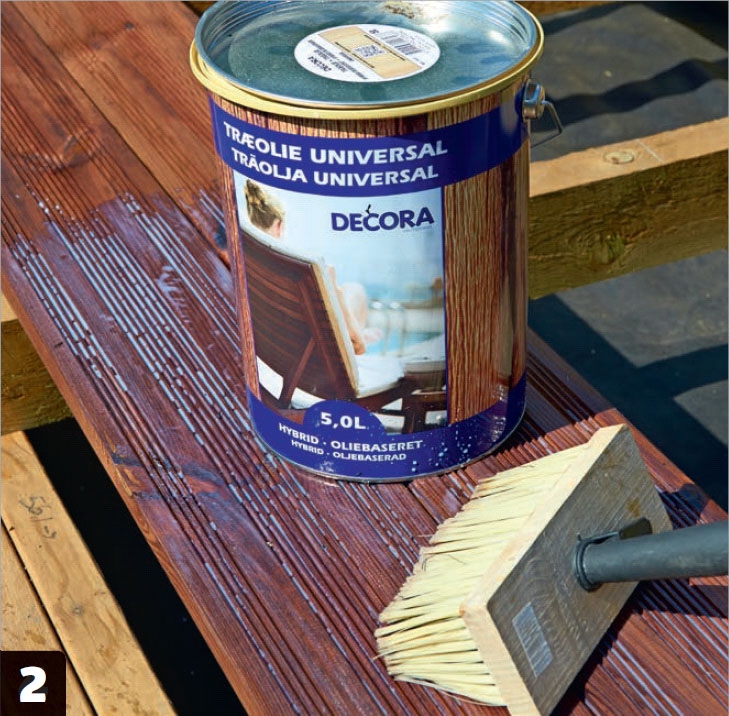 Olja träet. Innan vi skruvar fast terrassbrädorna oljar vi in dem med träolja på baksidan. När terrassen sedan är färdig, kan vi olja in brädorna en gång på den översta delen.