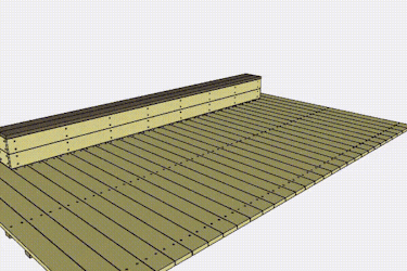 Lägg ut den första brädan. Den ska ligga vinkelrätt mot huset och sticka 4,5 cm ut över ändarna på reglarna (A). Skruva fast den enligt anvisningen.