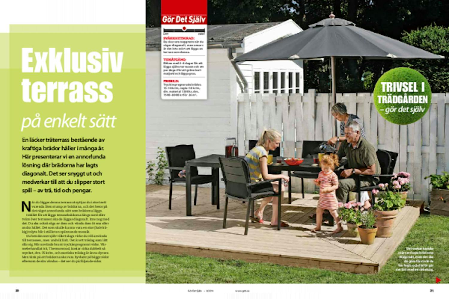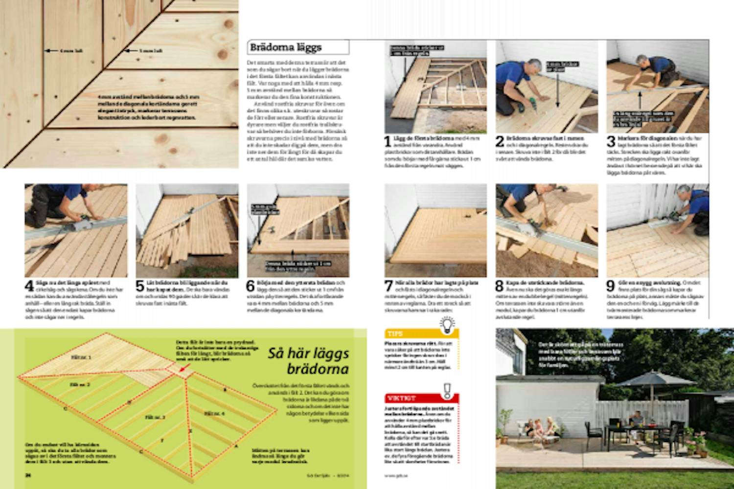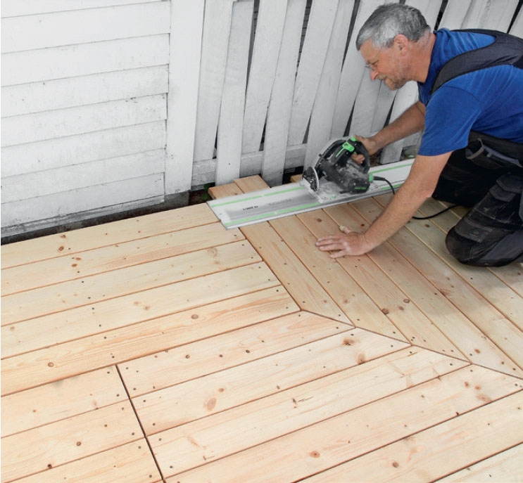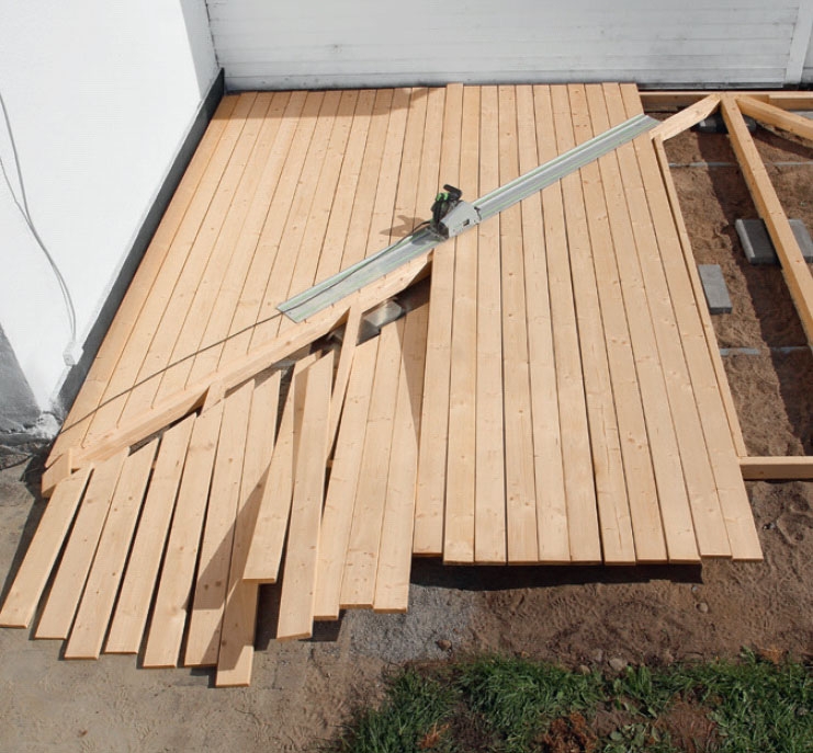 Du ska vara noggrann när du sågar diagonalt, men annars är det inte svårt att lägga en terrass som denna.