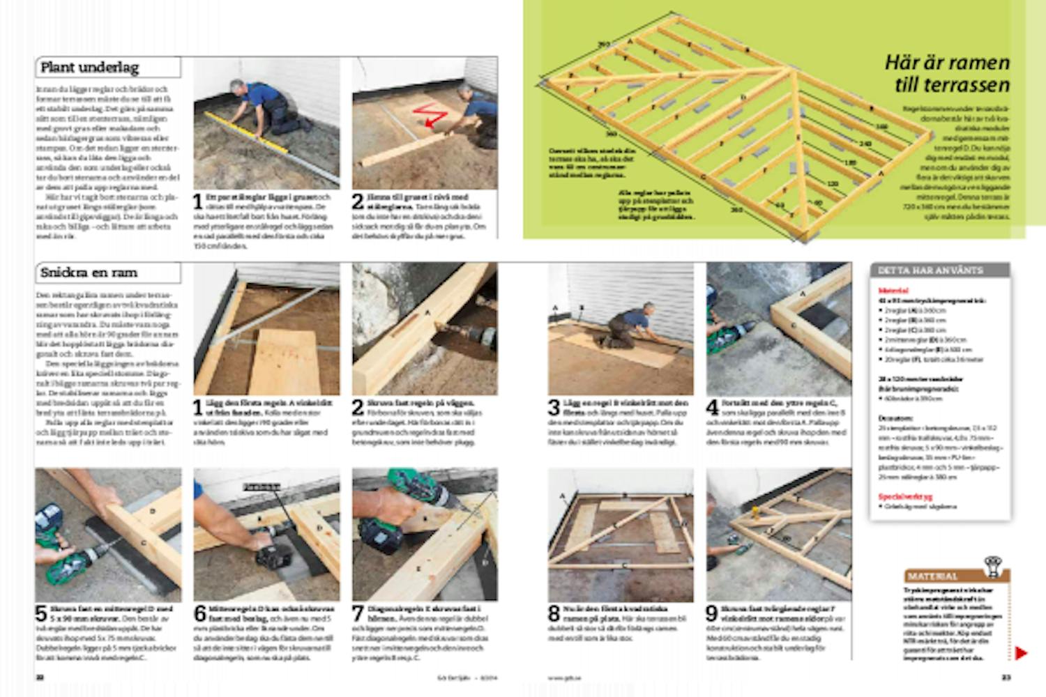 Den rektangulära ramen under terrassen består egentligen av två kvadratiska ramar som har skruvats ihop i förlängning av varandra. Du måste vara noga med att alla hörn är 90 grader för annars blir det hopplöst att lägga brädorna diagonalt och skruva fast dem.