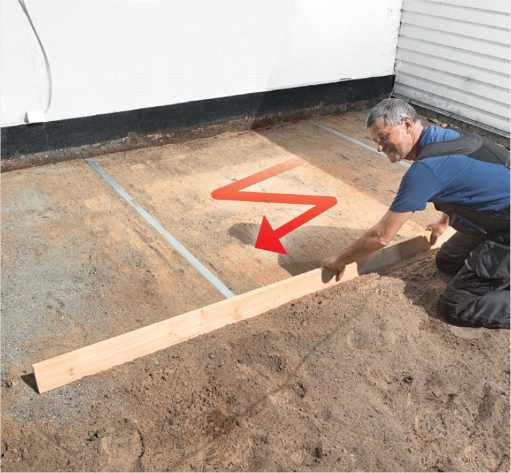 Ett par stålreglar läggs i gruset och rättas till med hjälp av vattenpass. De ska ha ett litet fall bort från huset. Förläng med ytterligare en stålregel och lägg sedan en rad parallellt med den första och cirka 150 cm från den.