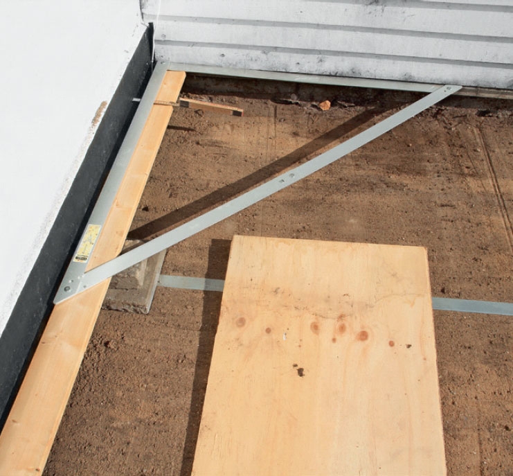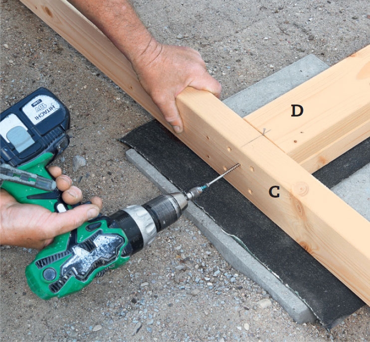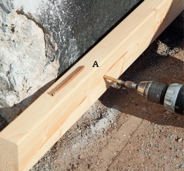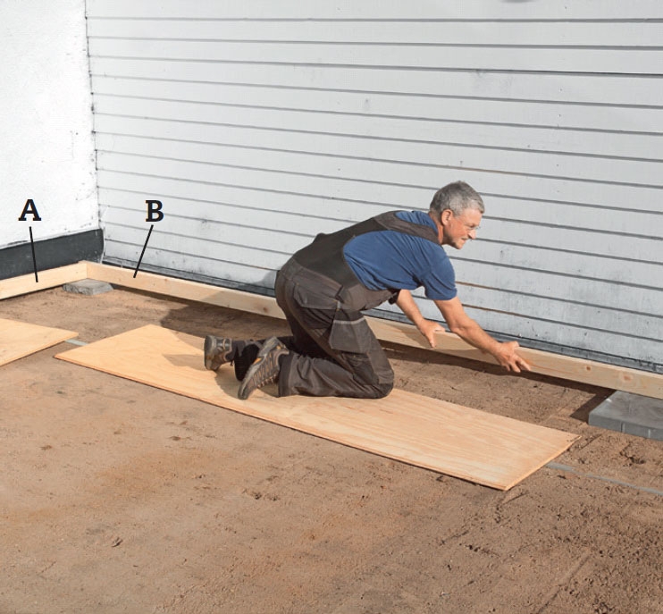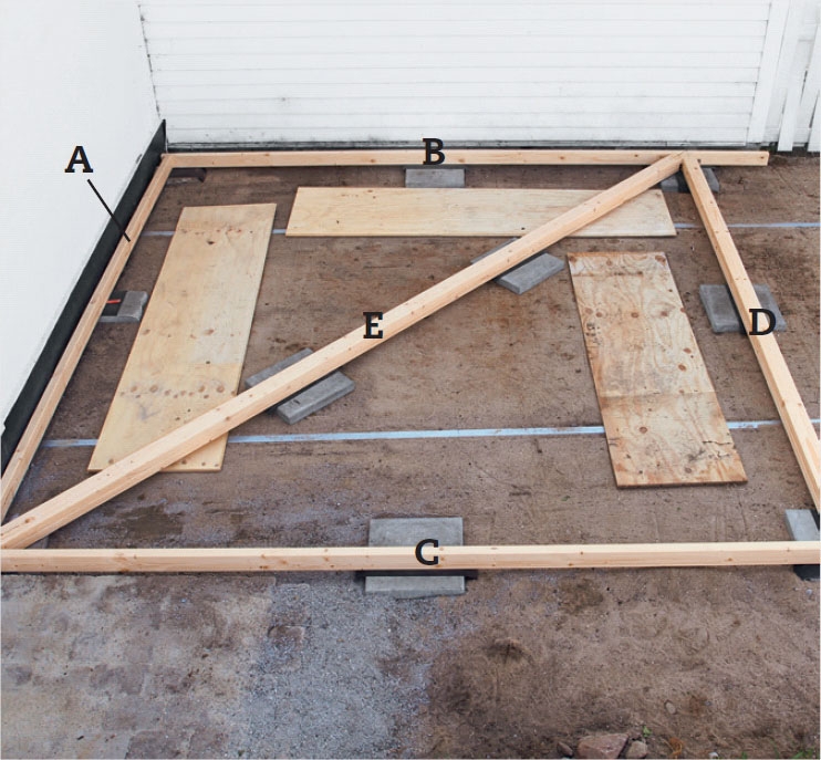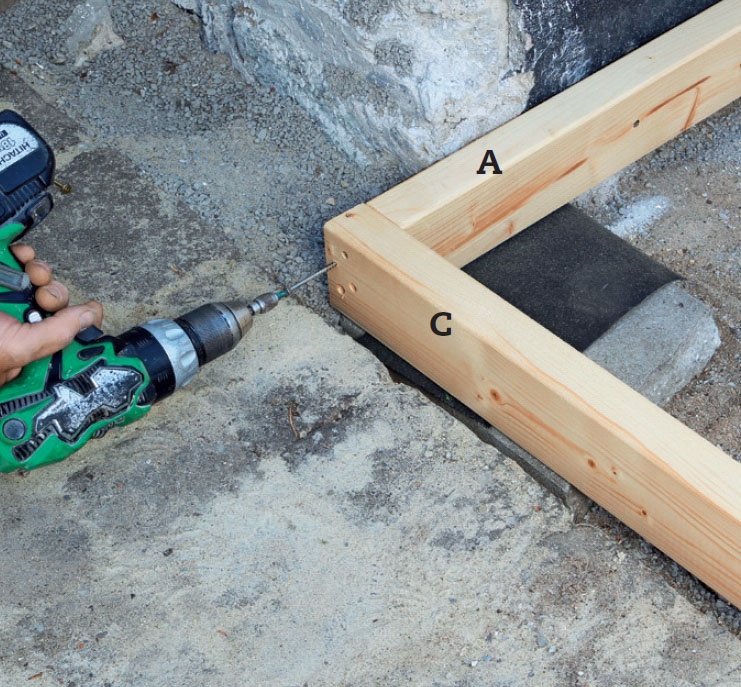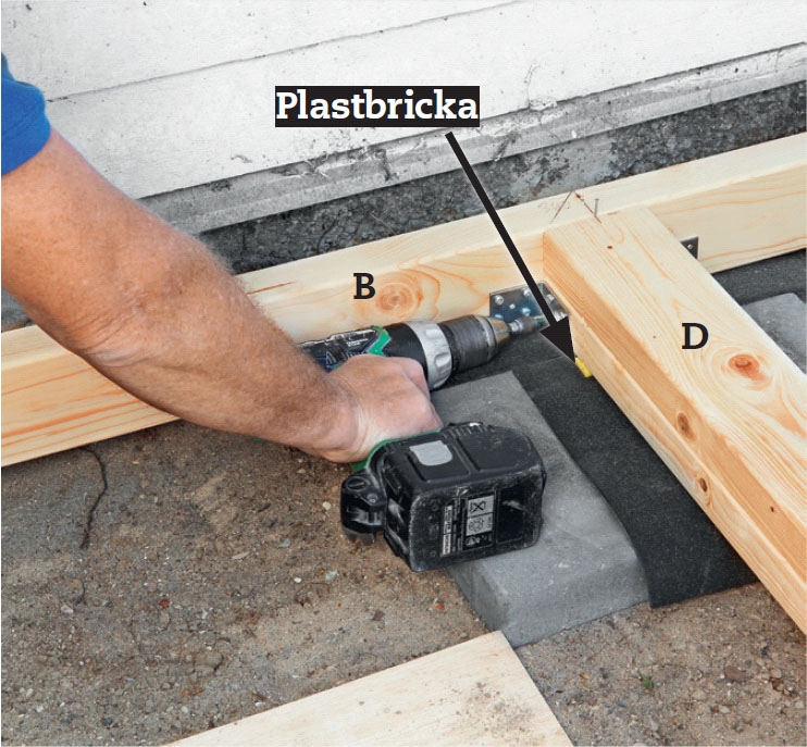 Lägg en regel B vinkelrätt mot den första och längs med huset. Palla upp den med stenplattor och tjärpapp. Om du inte kan skruva från utsidan av hörnet så fäster du i stället vinkelbeslag invändigt.