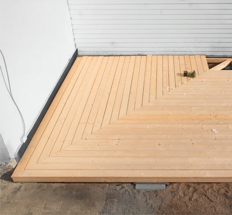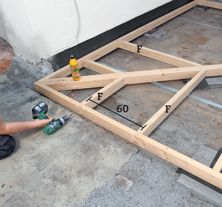 Den speciella läggningen av brädorna kräver en lika speciell stomme. Diagonalt i bägge ramarna skruvas två par reglar. De stabiliserar ramarna och läggs med bredsidan uppåt så att du får en bred yta att fästa terrassbrädorna på.