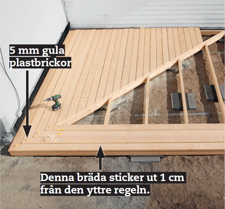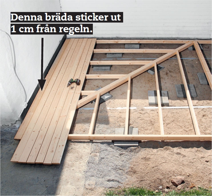 Börja med den yttersta brädan och lägg den så att den sticker ut 1 cm från utsidan på ytterregeln. Det ska fortfarande vara 4 mm mellan brädorna och 5 mm mellan de diagonala kortändarna.