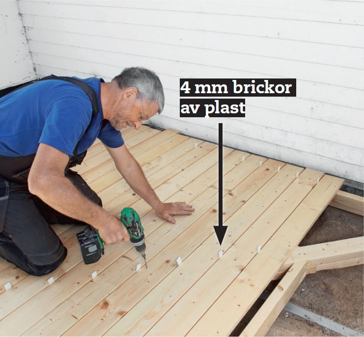 Lägg de första brädorna med 4 mm avstånd från varandra. Använd plastbrickor som distanshållare. Brädan som du börjar med får gärna sticka ut 1 cm från den första regeln mot väggen.