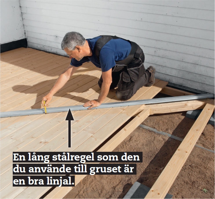 När alla brädor har lagts på plats och fästs i diagonalregeln och mittenregeln, så fäster du dem också i resten av reglarna. Dra ett streck så att skruvarna hamnar i raka rader.