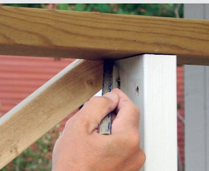 Räcket fästs på stolparna med 5 x 80 mm skruvar uppifrån. Se till att avståndet mellan stolparna är lika stort upptill och nertill. Håll en snedsträva mot hörnet och markera sågspåren med penna.