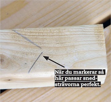 Kapa snedsträvor. Snedsträvorna görs av 45 x 45 mm reglar och sågas spetsiga i båda ändar. Håll fast snedsträvan med tving och markera både upp- och nertill. Då passar de perfekt.