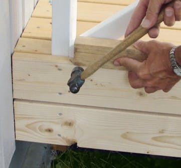 En sak är dock viktig: välj spikar eller skruvar efter både virket och klimatet. Lägger du tryckimpregnerad trall och terrassen finns vid havet, bör du använda rostfria eller syrafasta skruvar (spikar). Monteringen går snabbt och är den skojigaste delen av jobbet, för det är spännande att se hur terrassen blir mer och mer färdig.