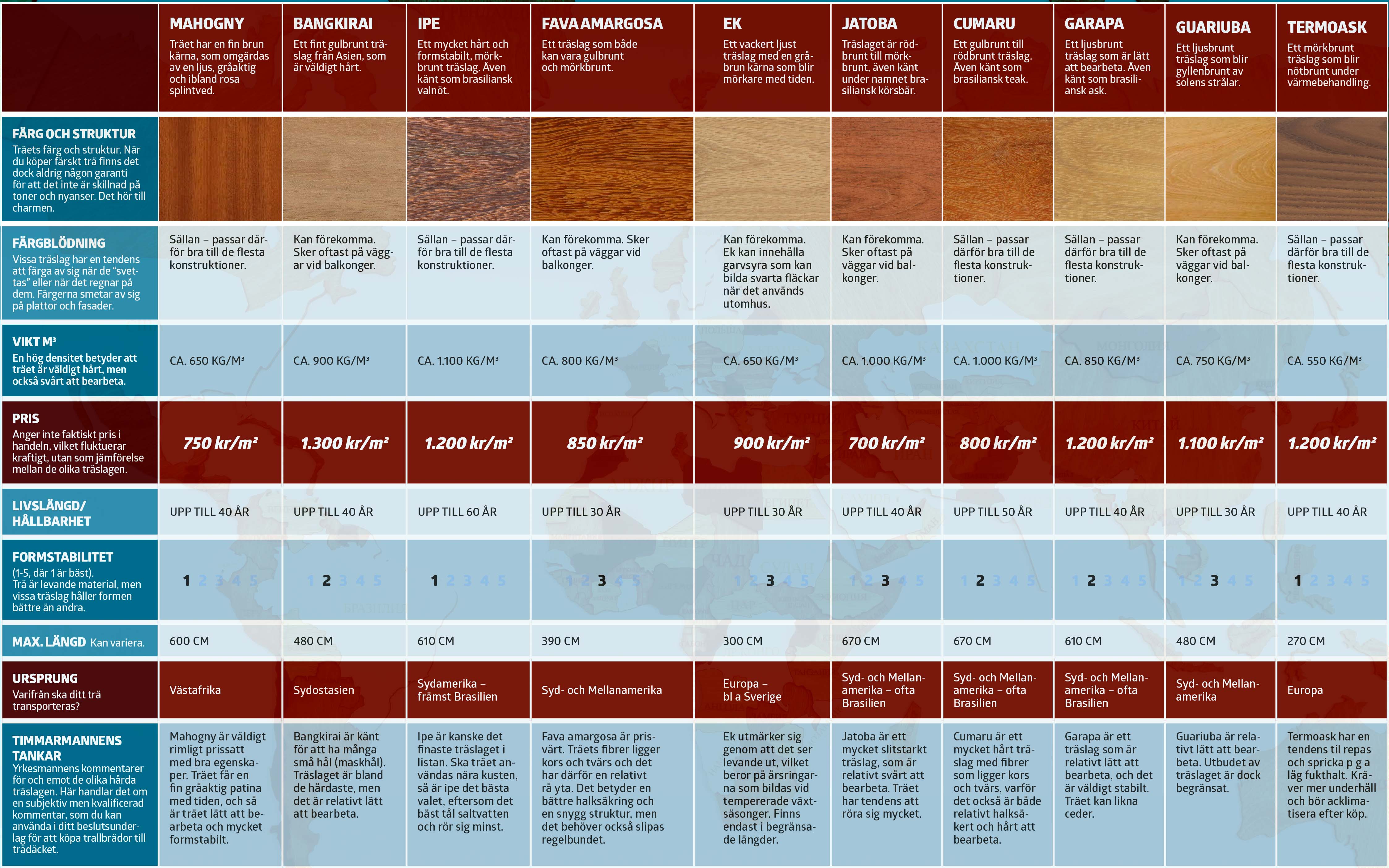 I den här tabellen får du en överblick över de vanligaste hårda träslagens färg, textur, pris, livslängd etc.