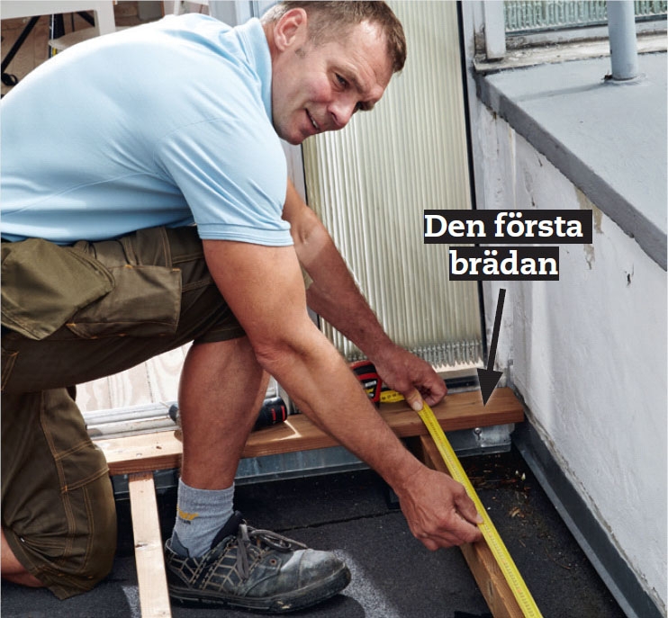 Lägg den första brädan vid väggen och håll ett par mm avstånd. Dra ett streck längs framkanten på brädan, men endast på de yttre reglarna.