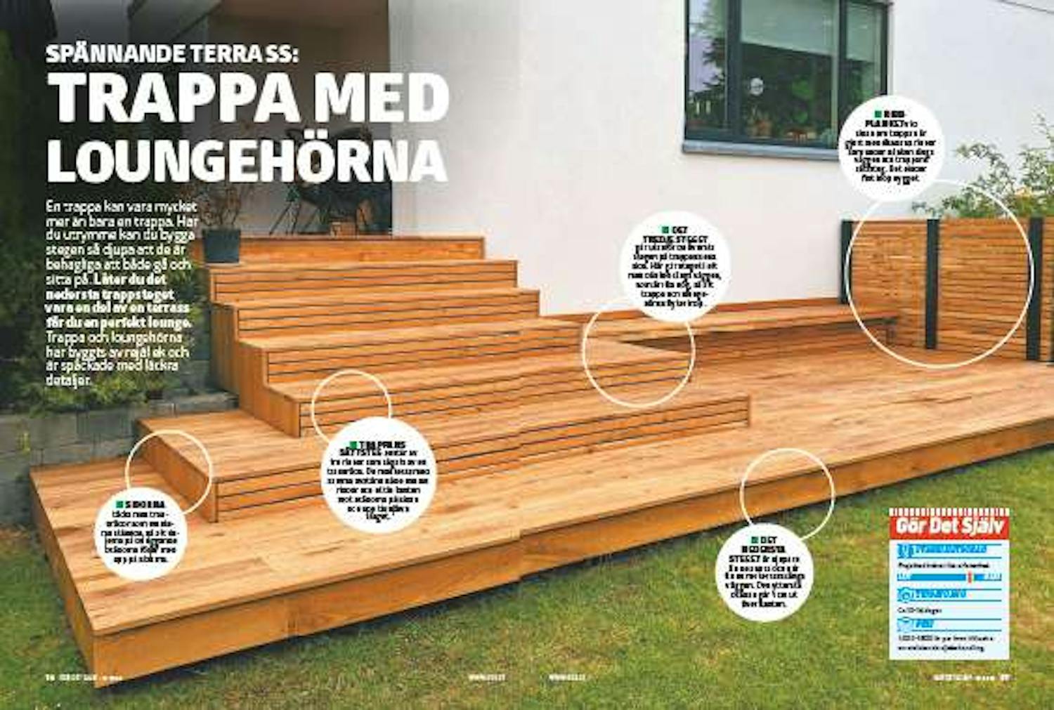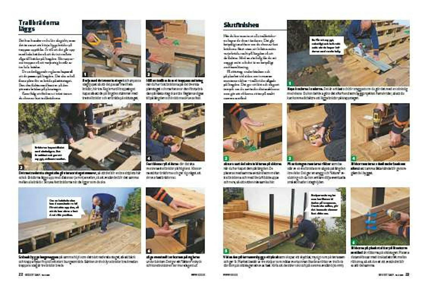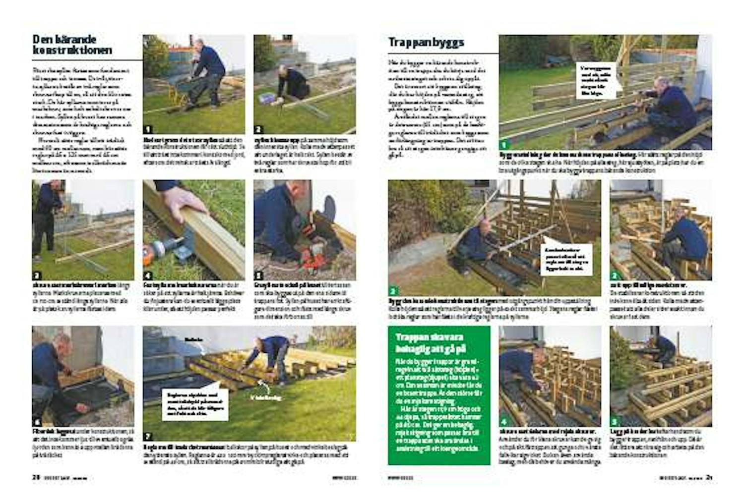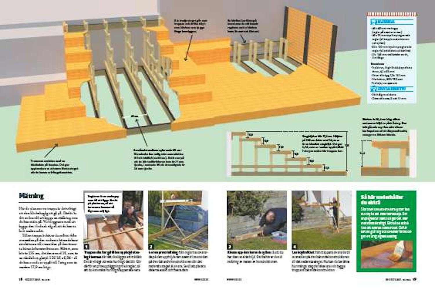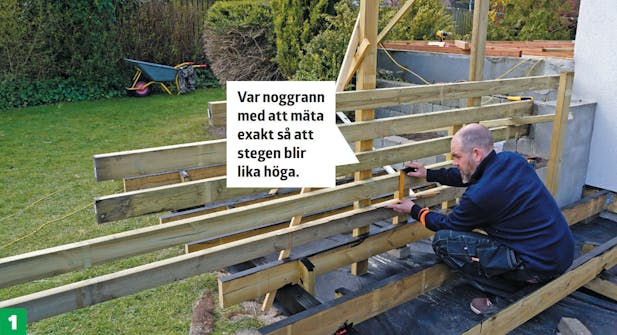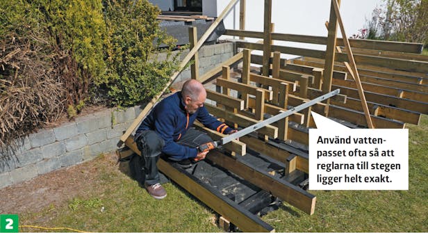 Börja med det översta steget och anpassa stegdjupet så att det passar med hela brädor, här tre. Reglarna till trappsteget kapas så att de på längden stämmer med tre trallbrädor och en bräda på sättsteget.