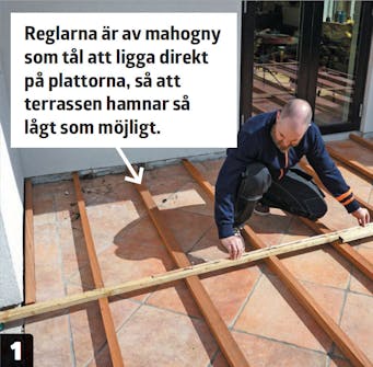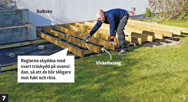 Normalt sätts reglar till ett trädäck med 60 cm mellanrum, men här sätts reglar på 45 x 125 mm med 45 cm mellanrum, eftersom trallbrädorna är lite tunnare än normalt.