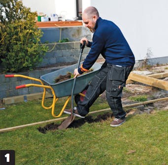 Nederst grävs det ut för syllen så att den bärande konstruktionen får rätt sluthöjd. Se till att träet inte kommer i kontakt med jord, eftersom det minskar träets livslängd.