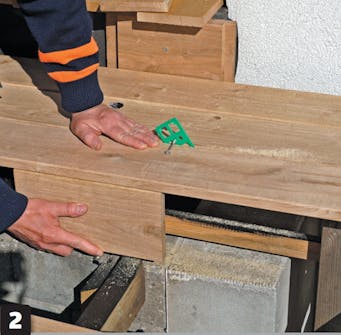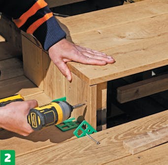 Fäst klossar på sidorna där det ska monteras trallbrädor på högkant. Klossarna stöttar brädorna och ger dig något att skruva fast brädorna i.