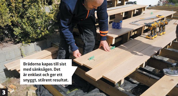 När du har monterat alla trallbrädorna kapar du dem i ändarna. Det går betydligt snabbare om du skruvar fast brädorna först utan att behöva mäta varje bräda exakt på längden så att de fluktar. Med en sänksåg får du ett snyggt snitt och det är en betydligt snabbare lösning.