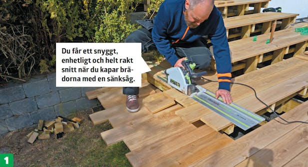 Kapa brädorna i ändarna. Det är enklast och blir snyggast om du gör det med en sänksåg med skena. Du kan behöva göra det efterhand som byggprojektet framskrider, så att du kan komma åt bättre att lägga brädor på trappstegen.