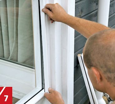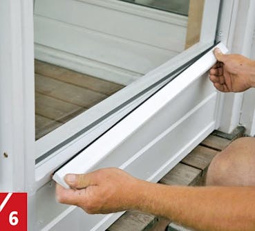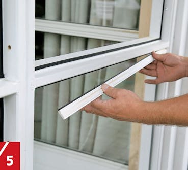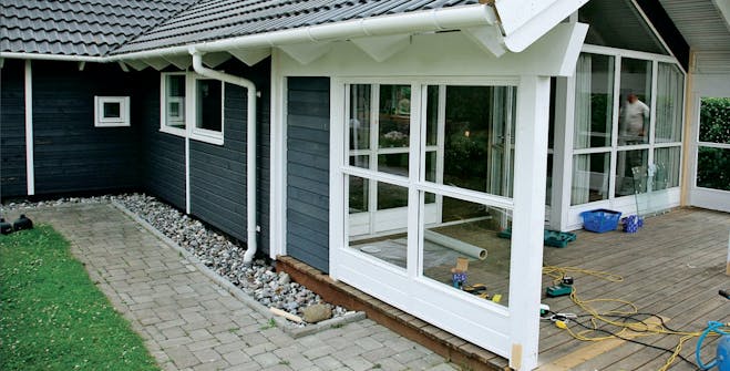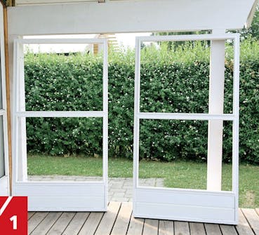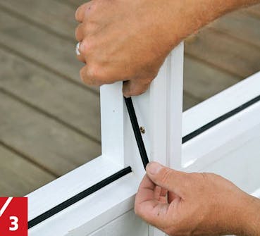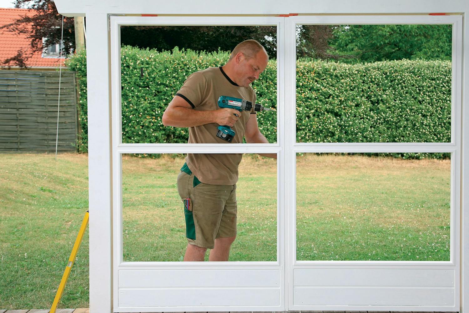 Rutorna sätts på plats i falsarna. Har du bara mätt rätt och sett till att ramarna står lod- och vågrätt, faller glaset på plats mot tätningslisterna utan att sitta i spänn.
