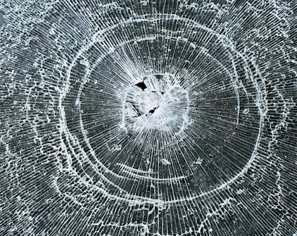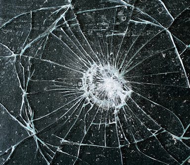 Vi tejpade klar folie på baksidan av härdat glas och fönsterglas för att underlätta städningen. Därefter tog vi fram en hammare och slog till.