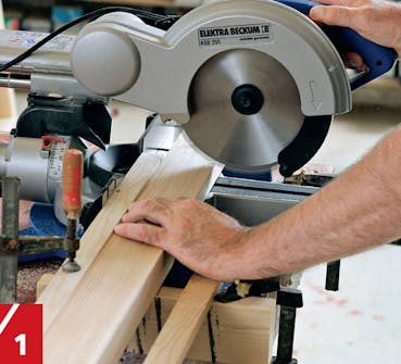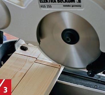 Delarna till ramen kapas i önskade längder. Till detta arbeta har du nytta av en kap- och geringssåg. Den kan du också använda när du senare geringssågar. Om sågen har utdragsskenor kan du också såga spår med den.