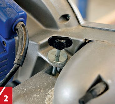 Kapsågar med utdragsskenor kan ställas in på önskat sågdjup. Det kan göras mycket exakt med en skruv på sågen. Här ställer vi sågdjupet på 11 mm.