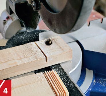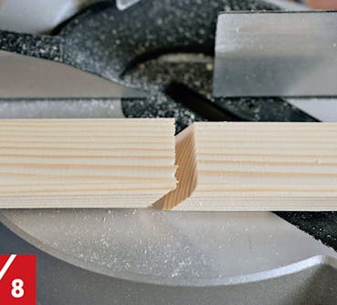 Med kap- och geringssågen sågar vi nu 15 x 44 mm lister, som kommer att utgöra fals i ramen. Fördelen med denna såg är att listerna kapas i exakt vinkel.