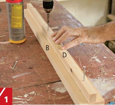 På insidan av bottenlisten (B) och på undersidan av den vågräta spröjsen (C) fästs 22 x 28 mm lister (D) i samma längd som den invändiga bredden på ramen. Listerna fästs längs mitten med lim och 4 x 50 mm skruvar.