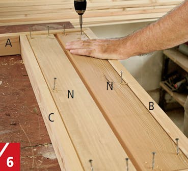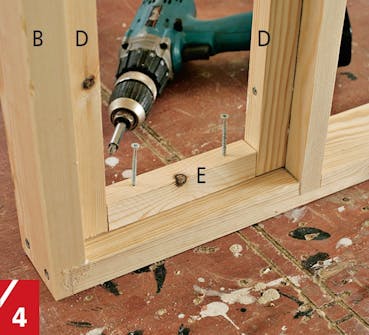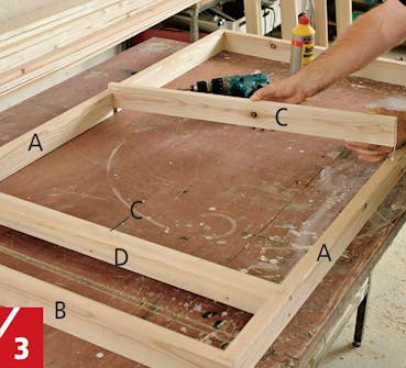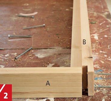 Botten- och topplist (B) sätts ihop med sidolisterna (A) till en ram. Pressa ihop delarna hårt i hörnen och förborra med 4 mm borr innan du limmar och skruvar ihop med 5 x 60 mm skruvar.