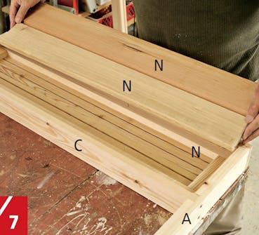 Spröjsen och kantlisten (C) pressas in i spåren, där de limmas och skruvas fast med 5 x 60 mm skruvar. Lägg märke till listen (D) på undersidan av kantlisten. Kolla med vinkel och tumstock att det blir rakt.