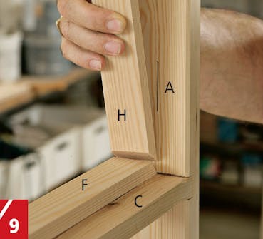 Spåren till de vågräta spröjsarna (C) markeras noga med vinkel. Såga därefter ett antal spår mellan de två strecken. Om klingan inte kan dras tillbaka över brädan kan du skjuta fram listen lite med en annan list. Stäm sedan bort träet mellan spåren.