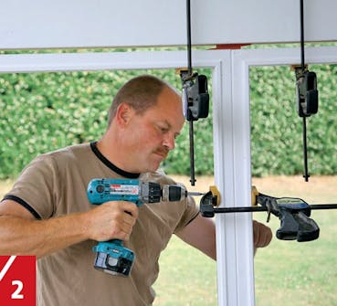 Ramarna sätts ihop två och två och hela fönsterpartiet justeras in vågrätt och lodrätt. Ev. skevheter elimineras med klossar eller kilar. Här har vi bestämt att det skall vara 5-10 mm luft runt om. Ramarna skruvas ihop med 5 x 40 och 5 x 60 mm skruvar.