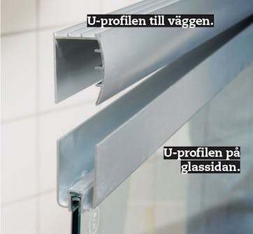 Både dörren och glasväggen ska monteras på väggen genom att skjuta in en U-profil, som redan sitter fast på dörr och glas, i en annan U-profil som först ska sättas fast på väggen.