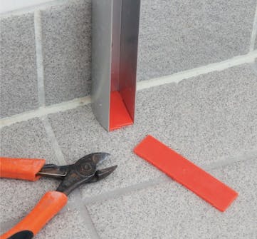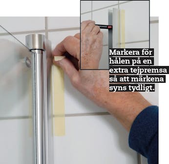 Sätt maskeringstejp på väggen när både dörr och glasvägg står lodrätt. Sätt tejpremsorna precis intill prof len både upptill och nertill vid hålen i prof len. Ta bort både dörr och glasvägg och sedan prof lerna. Sätt upp tejp för borrning av hålen.