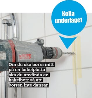 När du borrar hål i väggen för montering bör du veta vad väggarna är gjorda av. Här är det en skivvägg (våtrumsgips) bakom kaklet. Men de pluggar som medföljer monteringssatsen är avsedda endast för tegel, så därför måste vi skaffa riktiga skivpluggar. Det är ju viktigt att både dörren och glasväggen sitter fast ordentligt i kakelväggen.