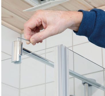 När du ska sätta upp glasväggen och dörren är det viktigt att du lyfter dem så att de inte släpar mot golvet, för då kan glaset spricka. Kolla noga att dörren kan öppnas och stängas utan problem.
