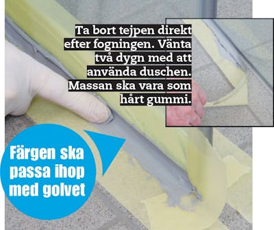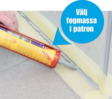 Nu ska du foga längs kanterna. Maskera med tejp på bägge sidor av springan och klicka fram fogmassa. Du ska använda en riktig fogpistol och en fogmassa av hög kvalitet. Längs sidorna av listerna används klar silikon.