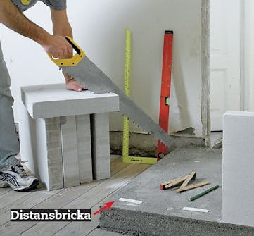Blocken av lättbetong är här 75 mm tjocka och de limmas fast på betongen med speciallim.