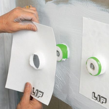 Sätt ut tätningskragar över uttagen för vattenledningarna så att de sluter helt tätt. Måla med tätskiktsprimer både före och efter monteringen av kragarna. Kom ihåg att nå ända in mot uttagen för vattenledningarna.