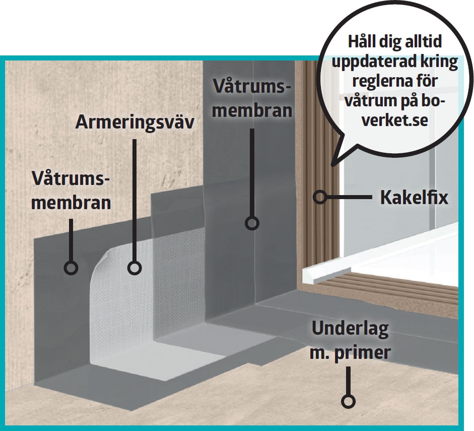 Den gummiartade tätskiktsprimern ska bilda en obruten film som tätar hela duschrummet. Vätskebaserade tätskikt och produkter som testats och godkänts av svenska Byggkera-mikrådet hittar du på www.gvk.se.
