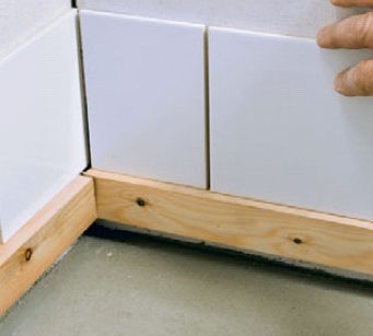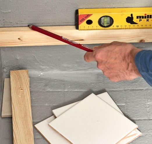 Skruva fast stödlisten på väggen i önskad höjd. Den ska användas som en slags hylla att ställa den första raden av kakelplattor på. Se till att läkten är helt vågrät. När du har satt alla kakelplattorna skruvar du bort läkten och tätar våtrumsmembranet genom att fylla alla hål med silikonfogmassa