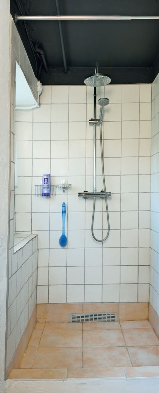 Vi har valt att inte centrera plattorna i duschrummet, men däremot följa det övriga källargolvets fogar. Man skulle även ha kunnat centrera dem och skurit till de yttersta plattorna. Det är helt och hållet en smaksak och har ingen betydelse för funktionen och hållbarheten.