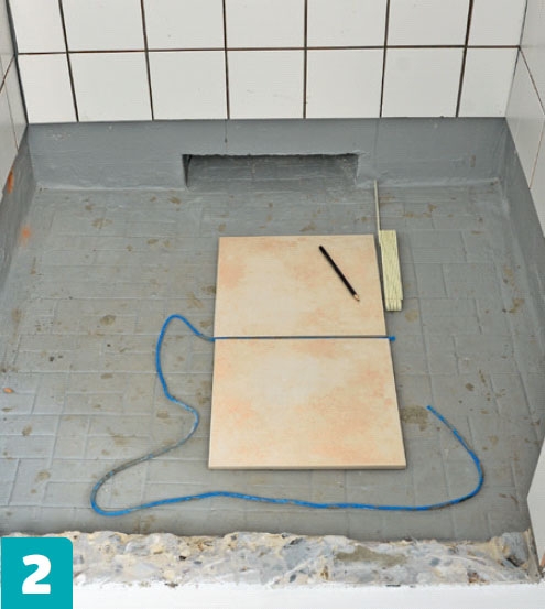 Lägg ut de två mittersta plattorna på golvet och rita upp. Stryk sedan kakelfix på både plattor och golv och lägg platta för platta.