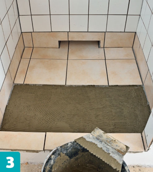 Skär till kantplattorna och limma upp dem på väggen. Enklast är att stryka kakelfixet på plattorna, eftersom utrymmet kan vara trångt.