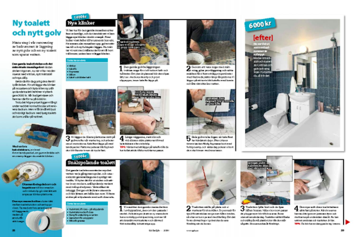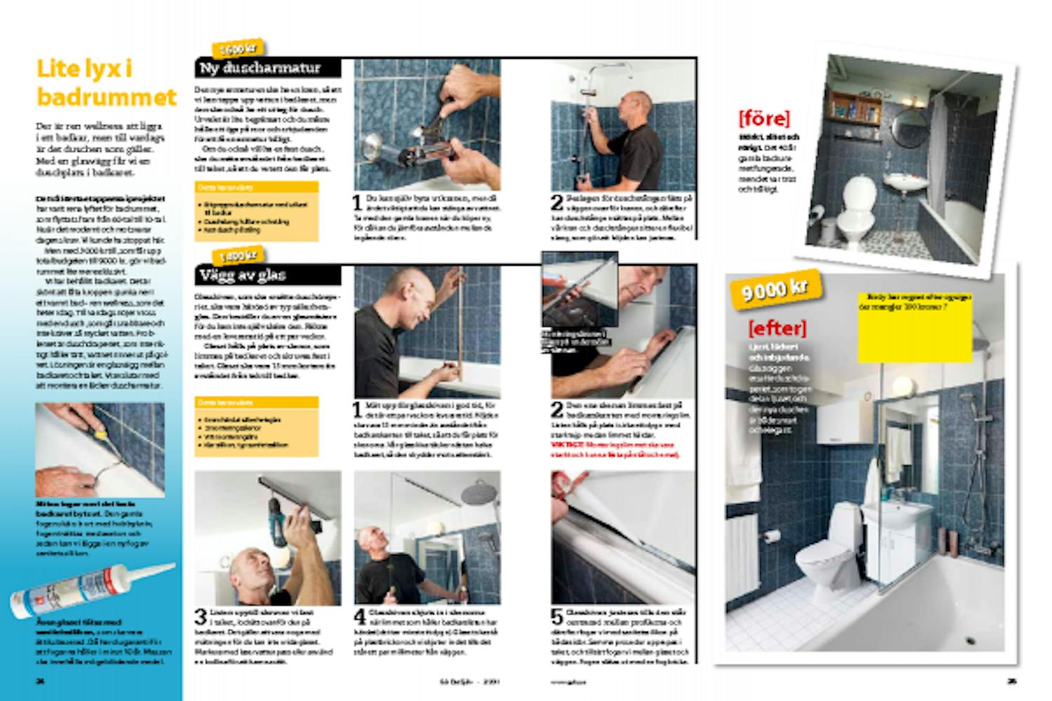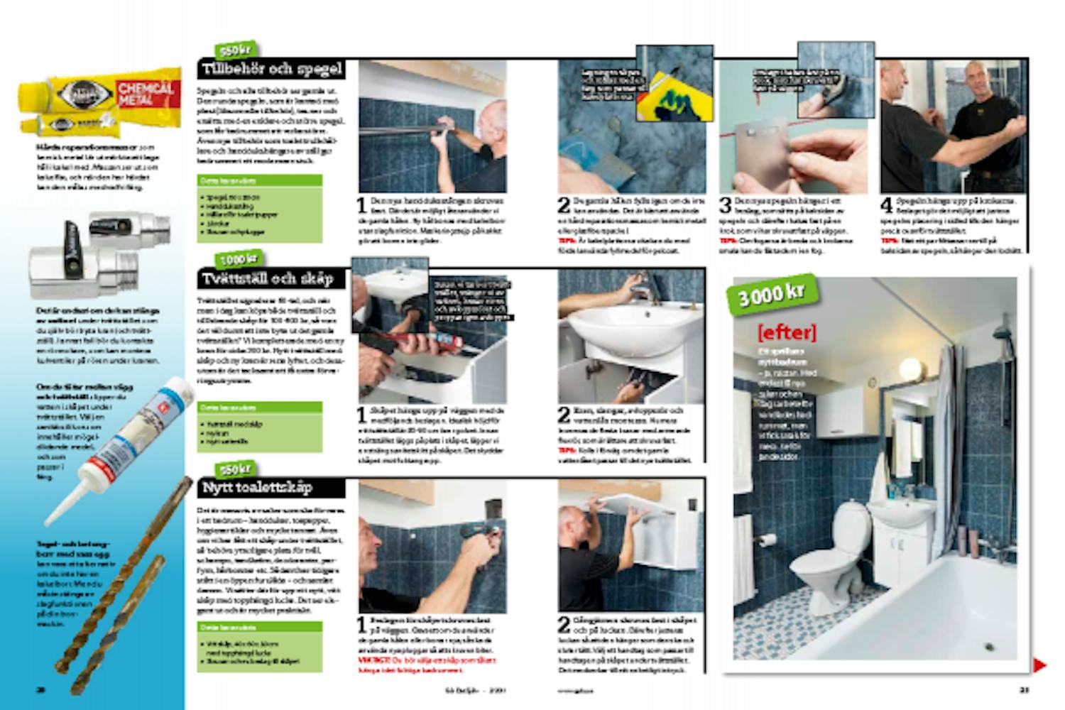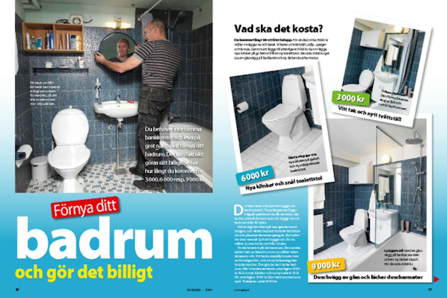Du kommer långt för ett litet belopp. För endast cirka 3000 kr målar vi väggarna och taket. Vi byter ut tvättställ, skåp, spegel och lampa. Genom att lägga till ytterligare 3000 kr kan vi lägga nya klinker på golvet och få en ny toalettstol. De sista 3000 kr ger oss en glasvägg på badkaret och ny, läcker duscharmatur.